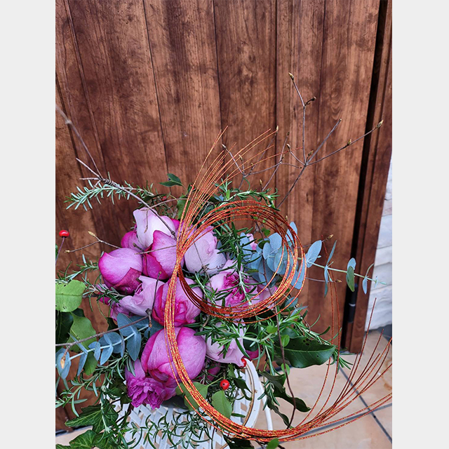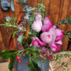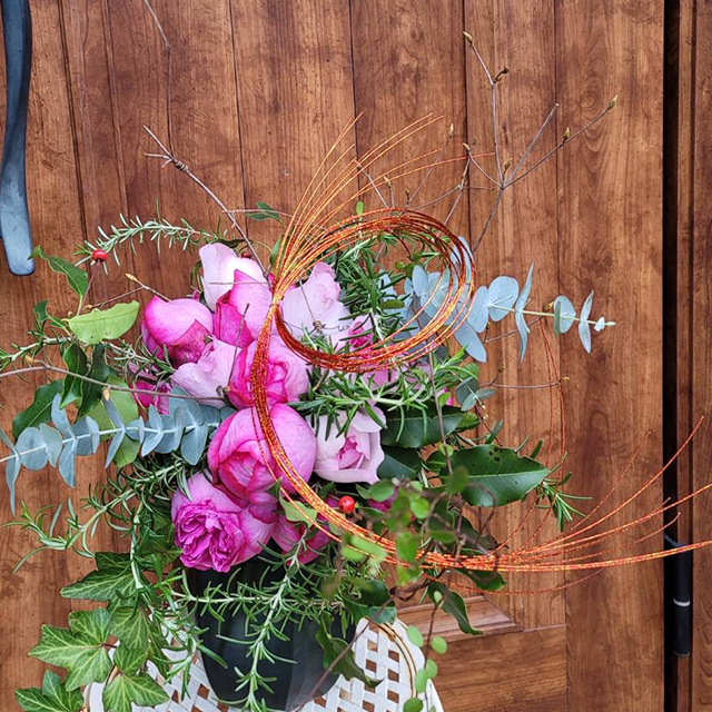 ピンク系の香り豊かなイブピアジェ、ピンクイブピアジェ等香りの薔薇とEnglish Garden からの季節のハーブをお摘みして、香りと共にお届け致します。